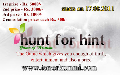 பதிவுலக வரலாற்றில் முதல் முறையாக டெரர்கும்மி நண்பர்களின் ஒரு புதிய முயற்சியாக பிரம்மாண்டமான புதிர் விளையாட்டு போட்டி - “HUNT FOR HINT” உங்கள் டெரர்கும்மி.காம் - இல் வரும் புதன்கிழமையன்று (17/08/2011) வெளியாகிறது. நண்பர்கள் அனைவரும் கலந்துகொண்டு முயற்சி செய்யுங்கள். நிச்சயமாக ’முயற்சி தன் மெய்வருத்தக் கூலி தரும்’ போட்டியில் கலந்துகொள்ளப்போகும் அனைவருக்கும் வாழ்த்துக்கள் :)